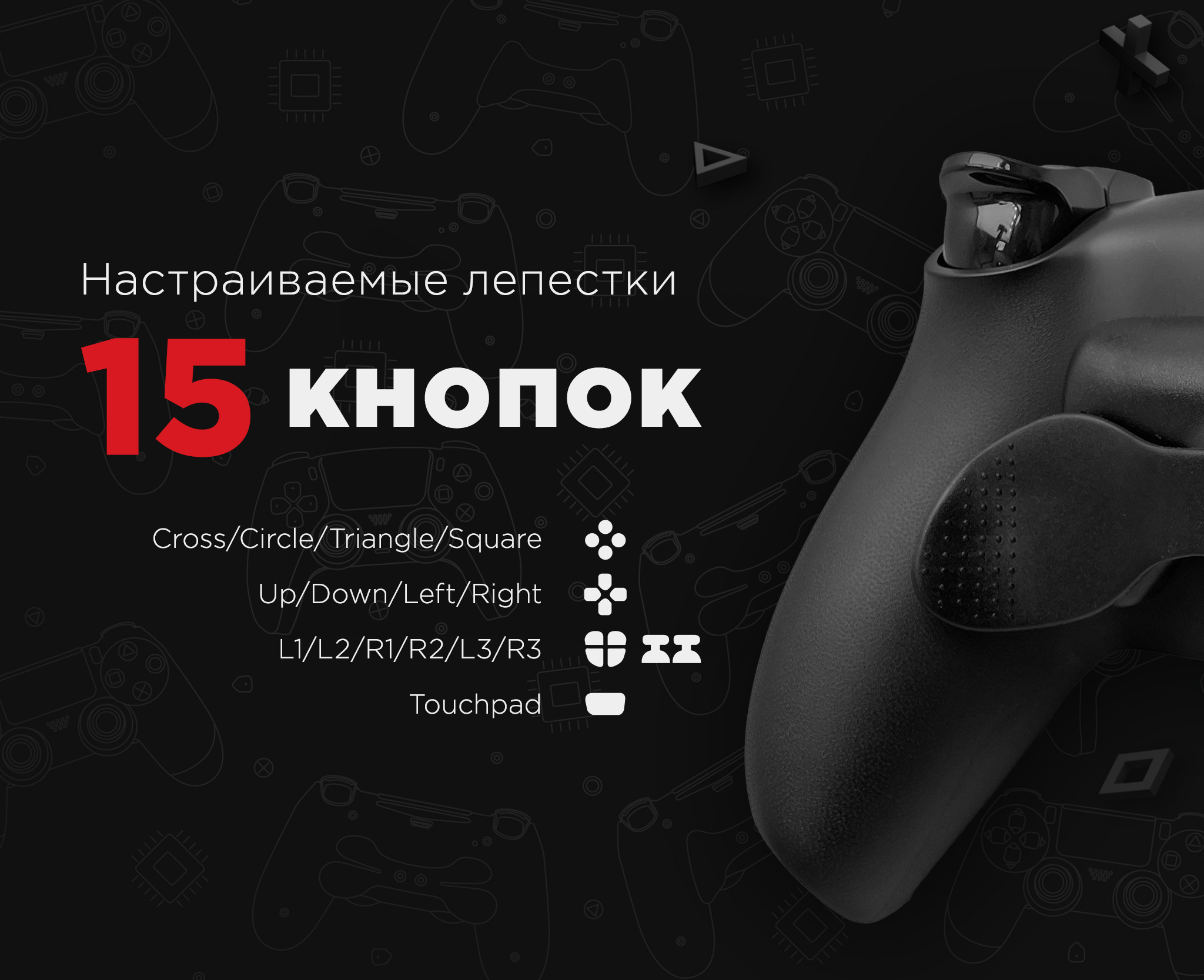 Представляем доработанный геймпад 5-го поколения от Sony DualSense (CFI-ZCT1W). У данного контроллера на задней части корпуса расположена накладка с 2 дополнительными кнопками (которые нажимаются при помощи нажимных элементов - "лепестков"), на которые можно продублировать нажатия всех основных кнопок (*за исключением L2, R2, OPTIONS, CREATE, TB и PS), а также настроить другие полезные функции. Переназначать и настраивать кнопки можно во время игры.